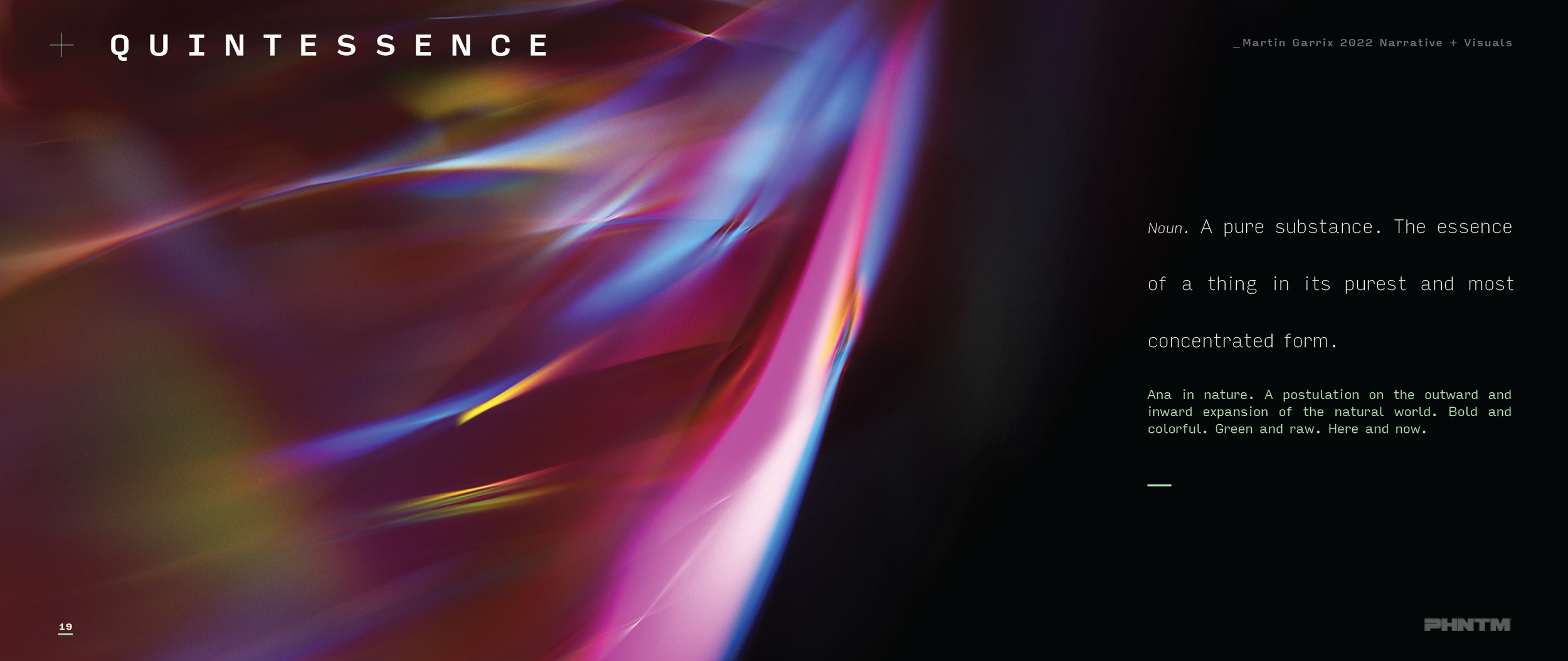 I developed the creative narrative for an esoteric, electronic concert series steeped in science fiction. I wrote a 45-page deck that informed the show’s visual direction, screen content, and ultimately, the name of Martin’s 2022 debut studio album.
